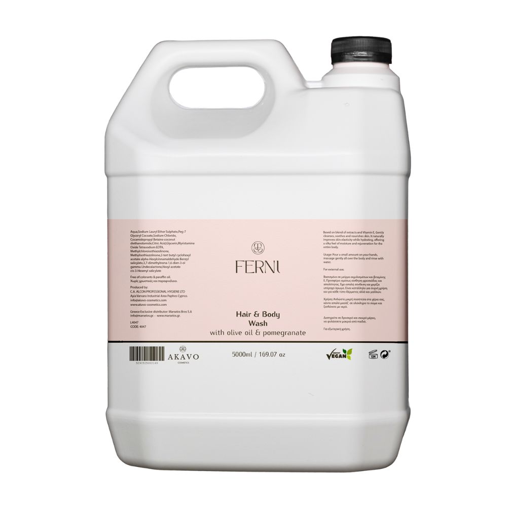 Το FERNI 2 σε 1 Σαμπουάν & Αφρόλουτρο με ρόδι και ελαιόλαδο σε επαγγελματική συσκευασία 5 λίτρων προσφέρει ολοκληρωμένη περιποίηση για μαλλιά και σώμα. Ο συνδυασμός φυσικών εκχυλισμάτων καθαρίζει απαλά, ενώ η βιταμίνη Ε, το ρόδι και το ελαιόλαδο ενυδατώνουν και αναζωογονούν την επιδερμίδα και τα μαλλιά.